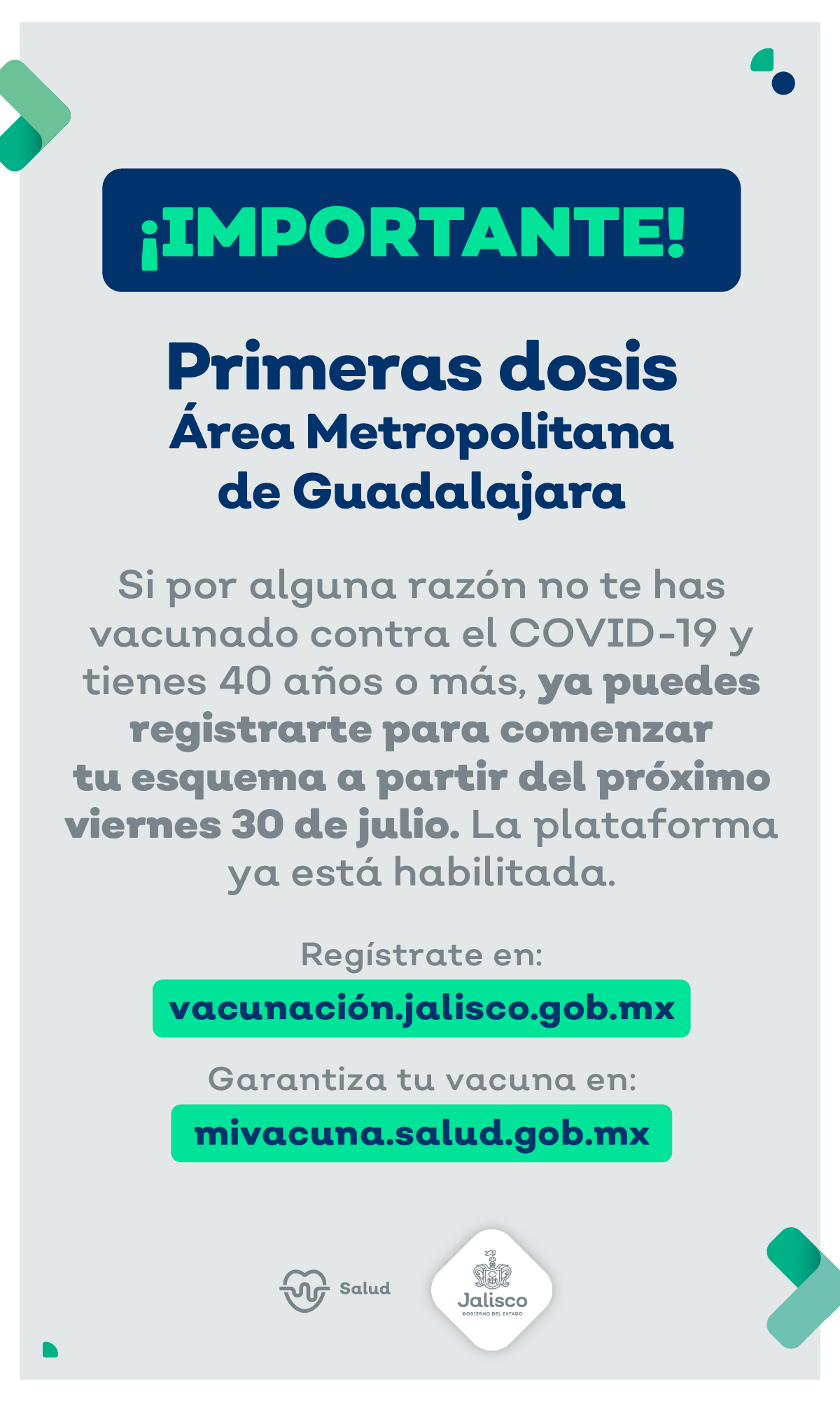 Vacunación 30 a 39 años: La secretaría resaltó que, por el momento esta primera jornada sólo será para la población entre 18 a 29 años de los municipios de guadalajara, zapopan, tlaquepaque, tonalá, tlajomulco y el salto. Confirma gatell registro para vacuna de personas 30+ confirma gatell registro para vacuna de personas 30+ 22 junio, 2021. La secretaría de salud jalisco informó ayer sobre la reciente llegada al estado de vacunas de varios laboratorios. El cargamento de este 24 de julio, corresponde a la entrega número 31 de vacunas asignadas a nuestro estado por parte de la federación. Inscríbete y completa tu registro para recibir la vacuna contra # covid19. Se entiende por vacuna cualquier preparación destinada a generar inmunidad contra una enfermedad estimulando la producción de anticuerpos. En guadalajara, ocotlán, ciudad guzmán y chapala se aplicará sinovac a partir del 13 de mayo con un horario. La secretaría de salud jalisco (ssj) informó que este. Jalisco recibe vacunas de sinovac. Para garantizar la vacuna debes registrarte en el portal federal mivacuna.salud.gob.mx y también tendrás que reservar tu cita en el portal estatal vacunacion.jalisco.gob.mx e imprimir el código qr que se te proporcionará. Bahía de banderas jalisco nayarit. Inicia registro en méxico sábado , 21.08.2021 / 21:06 hoy